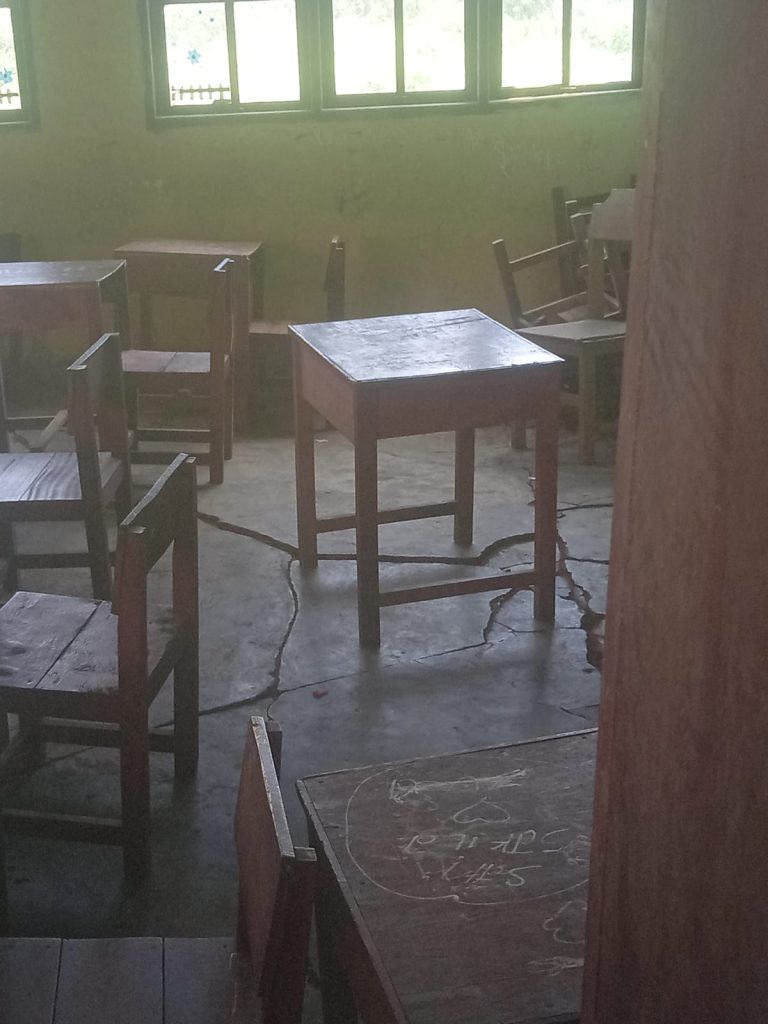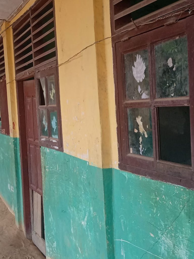 Namun faktanya, kondisi fisik sekolah tetap memprihatinkan, lantai retak, kaca jendela pecah, dan pintu kelas rusak parah.